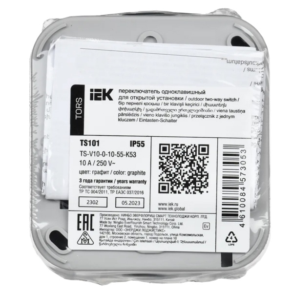 Проходной выключатель одноклавишный влагозащищенный для открытой установки, цвет графит Торс IEK TS-V10-0-10-55-K53