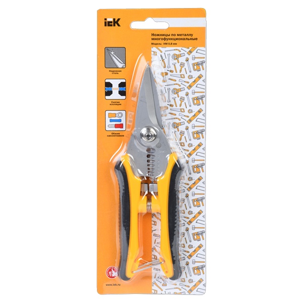 Ножницы предназначены для резки листового металла толщиной до 0,8 мм по прямой линии, снятия изоляции с проводников сечением от 0,3 до 6,0 мм2, а также опрессовки наконечников. Кроме того, они могут использоваться для резки кабелей, проводов и пластиковых элементов, что делает их универсальным инструментом для электромонтажных и слесарных работ. Эргономичная рукоятка обеспечивает удобный хват и снижает нагрузку на кисть при длительном использовании.