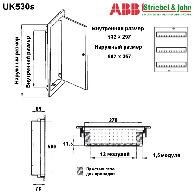 В комплект бокса ABB UK 500 входит DIN-рейки 3 по 12 модулей, шина «земля-ноль», набор бумажных табличек на самоклеющейся основе для информационных надписей.