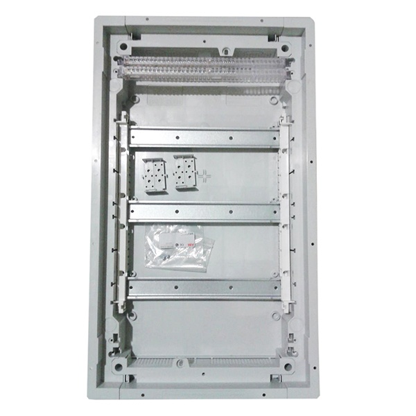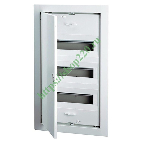 Электрический распределительный шкаф ABB UK 530 на 36 модулей предназначен для скрытого монтажа. Распределительный шкаф состоит из корпуса, защитной панели, рамы с металлической дверцей и рамки с DIN -рейками. Материал корпуса — самозатухающий термопластик серого цвета, защитной панели — самозатухающий термопластик белого цвета, с окнами для модулей. Защитная панель крепится к корпусу при помощи двух пластмассовых винтов. Дверца и рамка металлические, белого цвета, крепятся к корпусу при помощи саморезов, при желании можно установить дверку другого цвета или дизайна из серии BL. Дверца открывается вбок и может быть установлена как на правую, так и на левую стороны. На верхней и нижней стенках корпуса намечены прямоугольные отверстия для ввода кабеля.