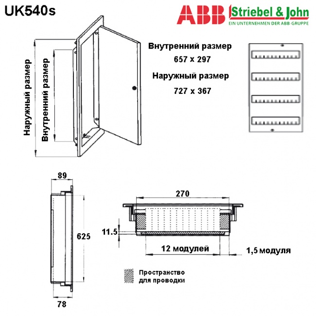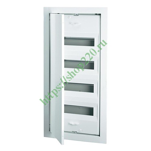 Электрический распределительный шкаф ABB UK 540 на 48 модулей предназначен для скрытого монтажа. Распределительный шкаф состоит из корпуса, защитной панели, рамы с металлической дверцей и рамки с DIN -рейками. Материал корпуса — самозатухающий термопластик серого цвета, защитной панели — самозатухающий термопластик белого цвета, с окнами для модулей. Защитная панель крепится к корпусу при помощи двух пластмассовых винтов. Дверца и рамка металлические, белого цвета, крепятся к корпусу при помощи саморезов, при желании можно установить дверку другого цвета или дизайна из серии BL. Дверца открывается вбок и может быть установлена как на правую, так и на левую стороны. На верхней и нижней стенках корпуса намечены прямоугольные отверстия для ввода кабеля.