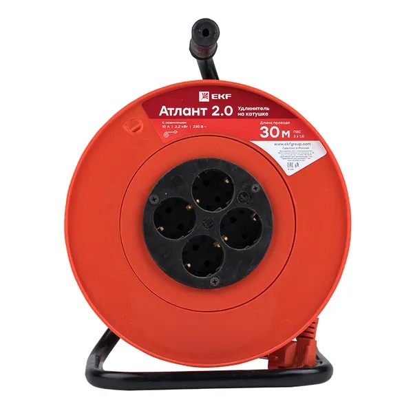 • Удлинитель на катушке EKF PROxima Атлант 2.0, 4 гнезда 30м с заземлением ПВС 3*1,0 10А/2,2кВт