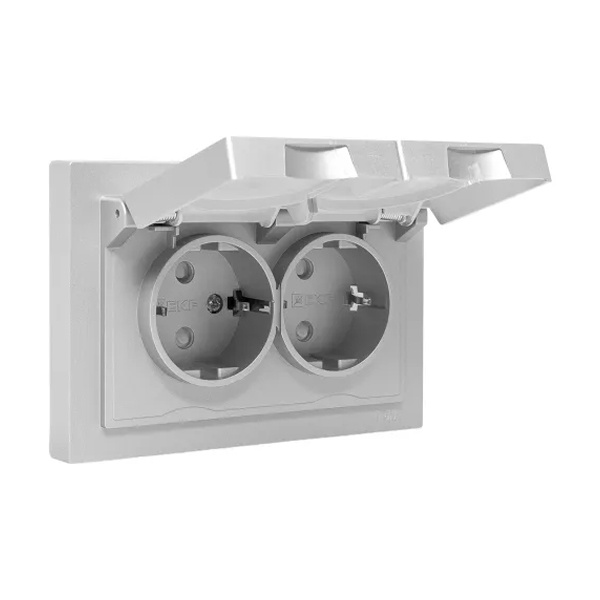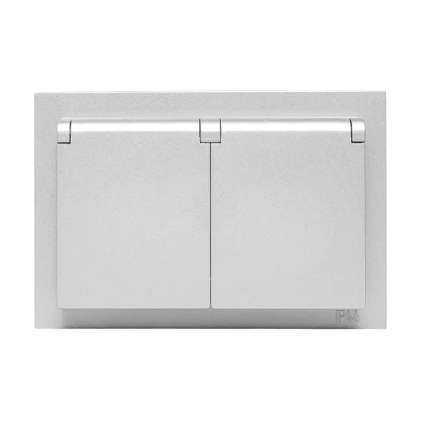Электрическая двухместная розетка с защитным заземлением, шторками и откидной крышкой, скрытой установки в одну монтажную коробку, алюминиевого цвета, винтовое подключение ЕКФ Эпика UP1-SOA-211-44