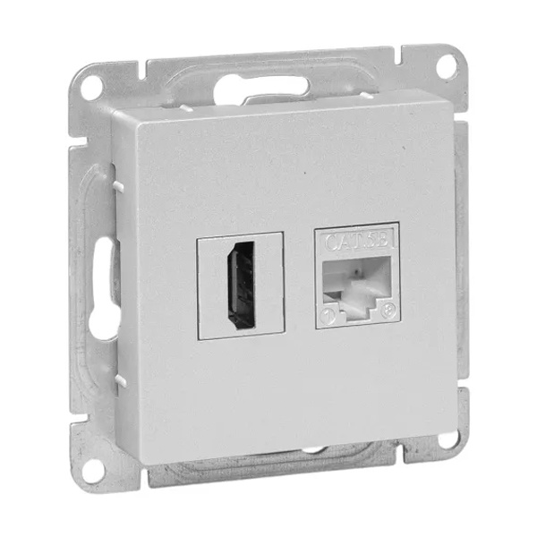 Комбинированная мультимедийная HDMI и информационная розетка RJ45 пятой категории скрытой установки цвета алюминий, Эпика UP1-SOA-HDMI+RJ45