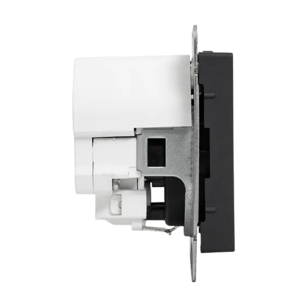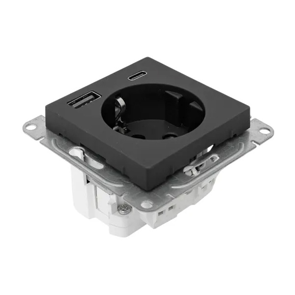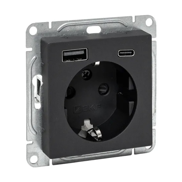Электрическая розетка с заземляющим контактом, шторками и USB портами скрытой установки черного цвета, винтовое подключение ЕКФ Эпика UP1-SOB-111-USBA+USBC