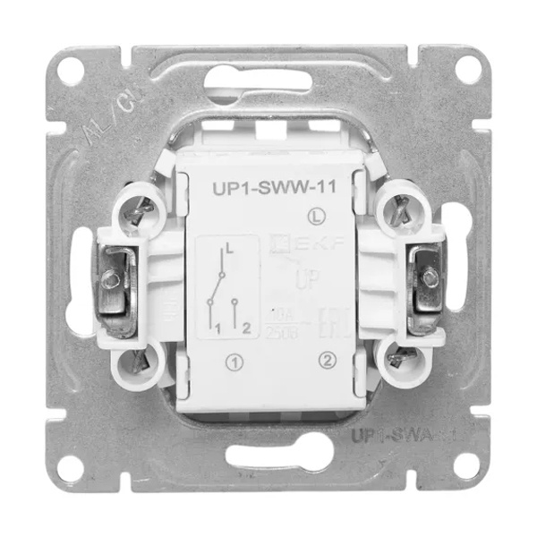 Механизм одноклавишного проходного выключателя скрытой установки алюминиевого цвета, винтовое подключение ЕКФ Эпика UP1-SWA-11