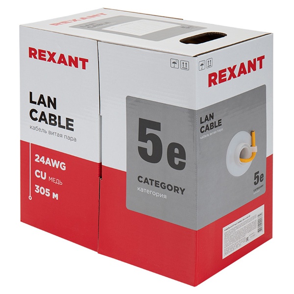 Кабель UTP 4PR 24AWG CAT5e 305м нг(А)-HF REXANT. Неэкранированная витая пара, материал проводника высокоочищенная бескислородная медь, диаметром 0,5 мм. (24 AWG). Материал оболочки – нг(А)-HF, огнестойкие, не распространяющие горение при групповой прокладке, безгалогенный композит, пониженной пожарной опасности с низкой коррозионной активностью продуктов горения и тления.