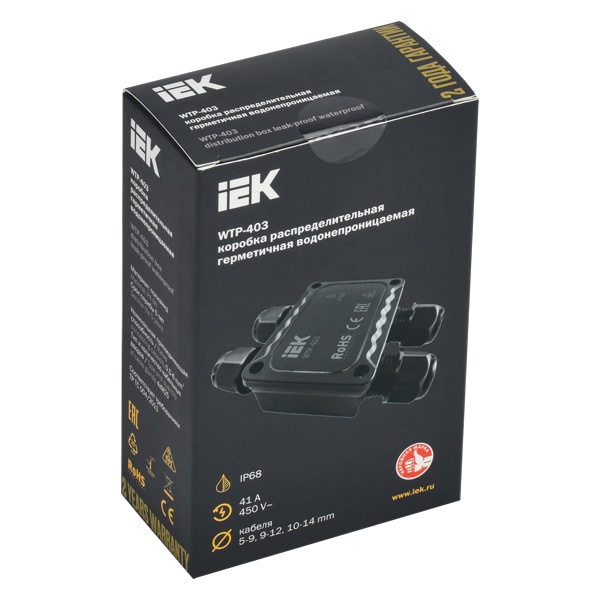 Коробка выполнена в герметичном исполнении с классом защиты IP68, что обеспечивает полную пыленепроницаемость и устойчивость к длительному воздействию влаги. Подходит для монтажа на открытых поверхностях.
