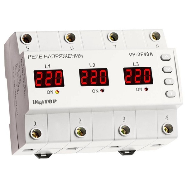 Реле напряжения VP-3F40A предназначено для защиты от перепадов напряжения однофазных или трехфазных потребителей с возможностью работы как трехфазное или как три однофазных реле.