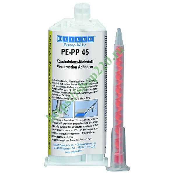 WEICON Easy-Mix PE-PP - клей для PE (полиэтилена) это двух компонентный конструкционный клей на основе метил акрилата. Его химическая структура обладает высокой силой для адгезии низкоэнергетичных пластиков и пластмасс PE, PP и TPE.