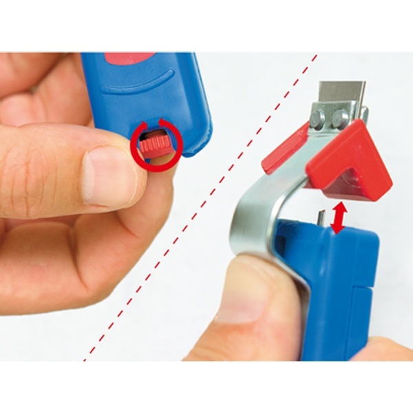 При помощи регулирующего винта в конце инструмента производится плавное бесступенчатое выставление глубины реза, что предотвращает повреждение изоляции жил проводов. Внутри инструмента вращающееся лезвие-эксцентрик автоматически поворачивается для поперечного и продольного реза.