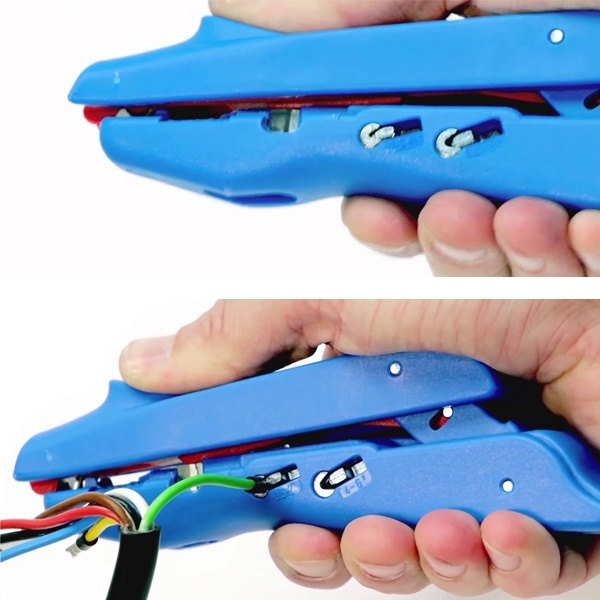 Дуо - кримп № 300 снимает изоляцию длиной от 5 мм, при этом предотвращая расщепление отельных проводов. После этого провод может быть скручен (закручен, перекручен). Для обжима втулочных наконечников в инструменте встроены 2 участка обжима от 0,5-2,5 мм2 и 4-6 мм2. В инструмент также встроен боковой резак для проводов диаметром до 6,0 мм2 (массивные кабеля до 4 мм2).