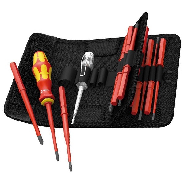 14 сменных отверток VDE с зауженным стержнем, с помощью которых можно достать расположенные в глубине винты и пружинные зажимы. Ручка-держатель 817 VDE Kraftform для комфортной работы и индикатор напряжения в прочной поясной сумке. Инструменты проверены поштучно по стандарту IEC 60900. Поштучная проверка в водяной бане под напряжением 10000 В для безопасной работы на оборудовании с максимально допустимым напряжением 1000 В.