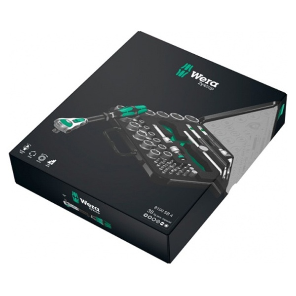 Набор инструментов производителя Wera серии 8100 SВ 4 Zyklop Speed представлен в оптимальной комплектации с трещоткой и популярным размерным рядом головок. Набор из 38 предметов находится в прочном металлическом кейсе и имеет следующую комплектацию: трещоточный ключ Zyklop с приводом 3/8 дюйма, 12 дюймовых головок Zyklop, 2 удлинителя Zyklop с гильзой свободного хода короткий и длинный, с быстровращающимся золотником и гибкой системой фиксации, 1 качающийся удлинитель Wobble, 1 вороток, 1 карданный шарнир, 1 переходник с быстрозажимным патроном, 19 битов. Трещоточный ключ применяется для торцевых головок и переходников под присоединительный квадрат 3/8 дюйма и оснащен шариковым фиксатором. Головка трещотки свободно поворачивается и может блокироваться в любом положении с помощью расположенного по обеим сторонам сдвижного стопора. Тонкий механизм зацепления на 72 зубца обеспечивает малый угол возврата 5 градусов. Точная фиксация в положении 0 градусов, 15 градусов и 90 градусов вправо/влево гарантирует уверенную работу без проскальзывания головки трещотки. Великолепно подогнанная по ладони форма ручки трещоточного ключа Kraftform обеспечивает комфортную работу. Все изделия в наборе оснащены индикаторами "Take it easy" с цветовой маркировкой размеров для легкого отбора необходимых инструментов.