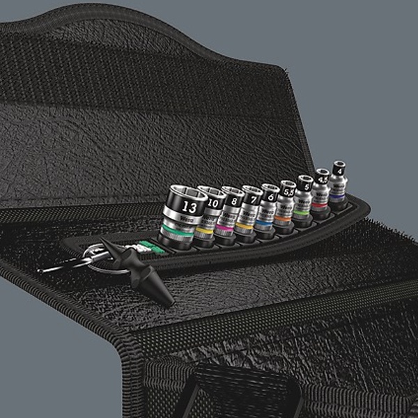 Набор торцевых головок 1/4 дюйма с функцией фиксации торгового знака Wera Belt А1 включает в себя: 9 торцевых головок от 4 до 13 мм Wera серии Zyklop 8790 НМА HF и извлекатель гаек. Инструменты надежно крепятся на стильном поясе из прочной материи. Отверточные головки с фиксирующей функцией незаменимы для комфортной работы с минимальным риском потерять винт еще до начала завинчивания. Фиксация шестигранного винта в торцовой головке обеспечивается двумя шариковыми фиксаторами и высокопрочным эластичным воротником. От механического повреждения его защищает стальной буртик, расположенный спереди. Это особенно помогает при работе в труднодоступных местах, куда для поддержки не помещается вторая рука. С помощью этого инструмента можно легко извлечь гайки из торцевых головок с фиксирующей функцией. Головки имеют цветовую кодировку размеров для простого и быстрого отбора нужных инструментов. Пояс оснащен карабином для крепления на темляке ремня или сумке. Его задняя сторона оснащена липучками для удобного расположения на стене, полке или системе переноски инструментов Wera 2 go.