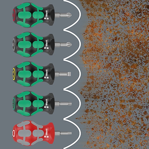 Особо короткая отвёртка для труднодоступных мест. Двухкомпонентная ручка Kraftform с практичным сочетанием мягких и твёрдых зон обеспечивает уверенный хват рукой и точные манипуляции. Рабочие концы изготовлены по той же технологии, что и биты Wera. Специальная обработка поверхности для особой защиты от коррозии и оптимальной посадки в головке винта. Шестигранный край ручки предотвращает надоедливое перекатывание отвёртки на рабочем месте.