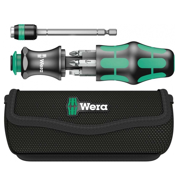 Компактные инструменты Wera подходят одновременно для завинчивания как в ручном, так и машинном режимах. Система "Одна ручка – много насадок" компактной конструкции с рабочими концами разных профилей, размещенная в компактном футляре, делает работу мобильной и гибкой. Подходит для битов с шестигранным хвостовиком 1/4" по стандарту DIN ISO 1173-C 6,3 и E 6,3 (ISO 1173) и с типами хвостовика Wera 1 и 4. С переходником, выдвижным стержнем, патроном Rapidaptor. Многокомпонентная ручка Kraftform с защитой от перекатывания, для особенно эргономичного завинчивания. Встроенный магазин для хранения битов. Данный набор заменяет набор из шести отверток и снижает до минимума необходимый комплект. Утапливаемый в ручке выдвижной стержень с быстрозажимным патроном позволяет легко обращаться с инструментом даже в тесном пространстве, если стержень не выдвинут. Рабочий стержень легко выдвигается простым нажатием на стопорное кольцо. После этого ручку-держатель можно использовать как полноценную отвёртку. Выдвижной стержень можно извлечь и использовать в качестве адаптера с машинным приводом или вернуть в исходное положение. В практичной поясной сумке.