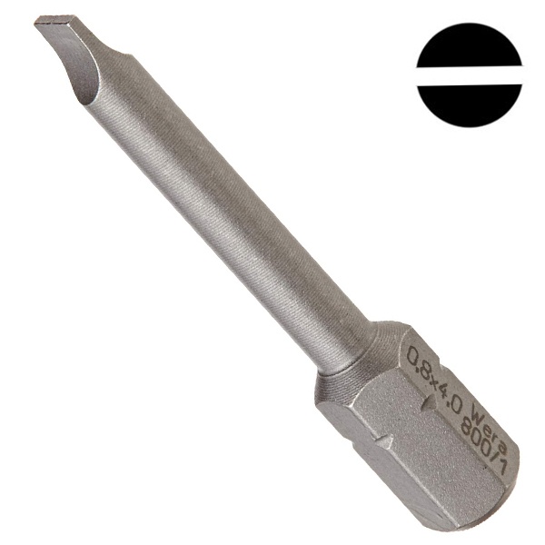 Короткая шлицевая бита для шуруповертов и отверток компании Wera типа 800/1 серии Z пригодна для винтов со шлицем. Ширина жала 4 мм. Длина биты равна 39 мм, толщина наконечника составляет 0,8 мм. Форма ее рабочей части представляет собой плоскую лопатку. Она предназначена для работы с винтами, которые используются в простейших соединениях. Этот инструмент широко применяется в быту. Его привод соответствует стандартному шестиграннику 1/4 дюйма. Насадка универсального применения закалена до вязкой твердости, это препятствует преждевременному разрушению ведомого наконечника. Бита изготовлена из высококачественной стали и обладает необходимым значением твердости и прочности. Страна производства инструмента – Чехия. Гарантийный срок службы изделия – 2 года.