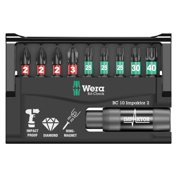 Держатель с круглым магнитом с набором битов (9 штук) для отверток и шуроповерта, с алмазным покрытием Bit-Check 10 Impaktor 2 WE-057682