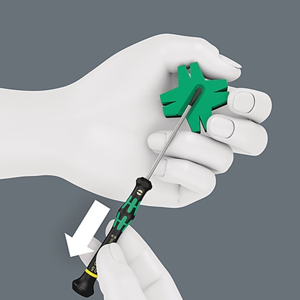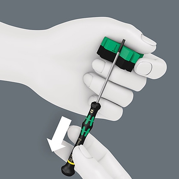 С помощью приспособления для намагничивания и размагничивания Wera: Просто провести отверткой вдоль выемки с положительным зарядом приспособления Wera. Теперь инструмент будет прочно удерживать винт.