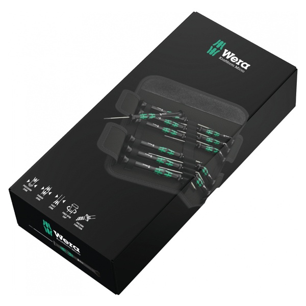 Отвёртки Wera Micro в наборе Set для тонкой работы. За счёт опоры ладони на подвижную головку и расположенной под ней зоны быстрого вращения можно работать отвёрткой в скоростном режиме. Не надо тратить время на перехватывание инструмента. Хранение и транспортировка в прочной поясной сумке, так что инструмент всегда под рукой.