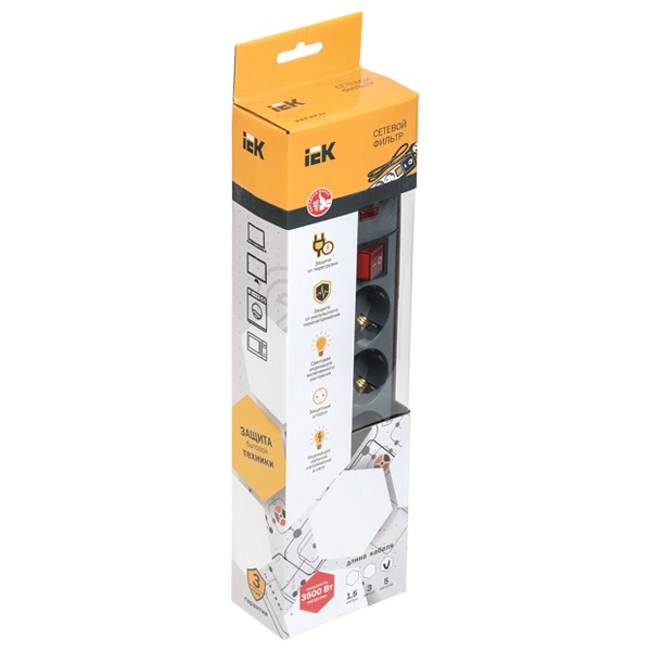 В сетевом фильтре предусмотрен выключатель со световой индикацией состояния сети (вкл-выкл). Термовыключатель для защиты от перегрузок автоматически включается при восстановлении нормального режима работы сети. Встроенный варистор защищает от импульсных бросков. Защита от превышения мощности нагрузки обеспечивает отключение питания всех розеток от сети при превышении нагрузки.