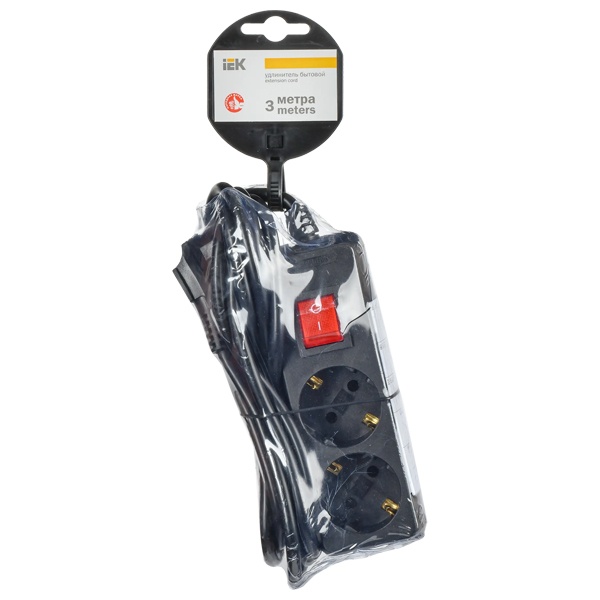 Черный бытовой удлинитель с выключателем на две розетки с заземлением, длина 3 метра WYP10-16-02-03-ZK-K02