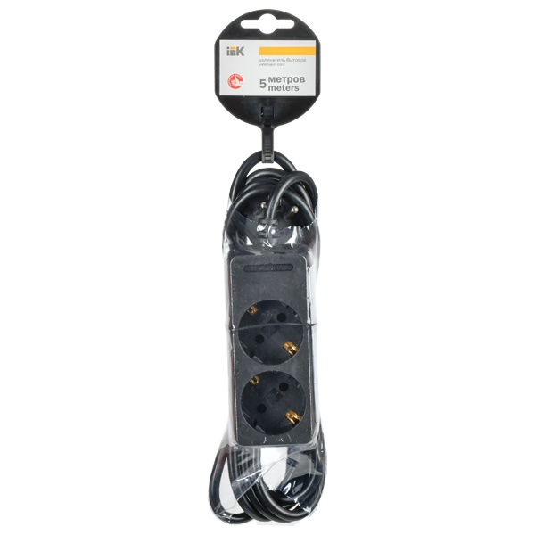 Удлинитель бытовой черного цвета на две розетки с заземлением, длина 5 метров WYP10-16-02-05-Z-K02