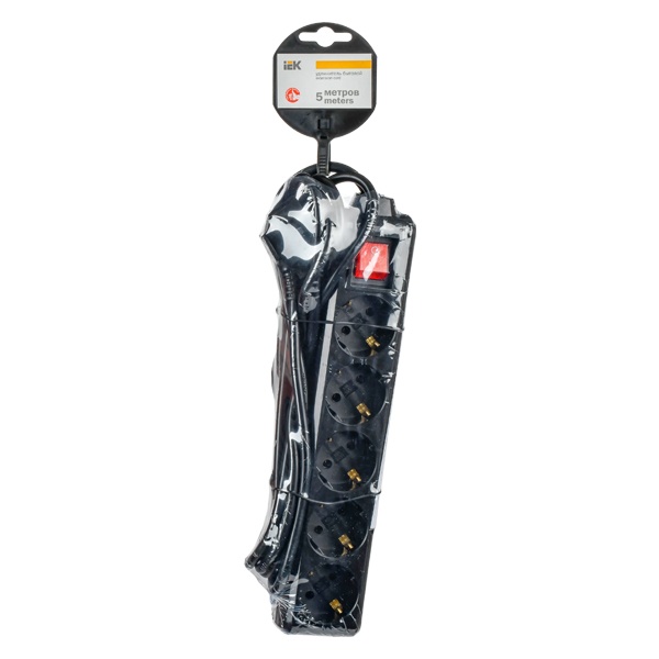 Черный бытовой удлинитель с выключателем на пять розеток с заземлением, длина 5 метров WYP10-16-05-05-ZK-K02