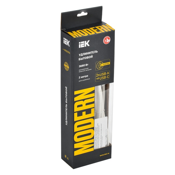 Удлинитель 3х2м с заземл. 16А 250В MODERN У03В с выкл. USBх3 (type-Aх2шт + type-Cх1шт) ПВС 3х1 бел. IEK WYP12-16-03-02-ZKU-K01