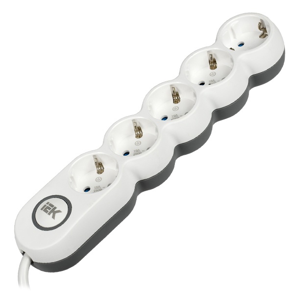 Бытовой электрический удлинитель с выключателем на колодке, 5 розеток с заземлением и шторками, длина провода 1,5 метра, цвет белый/серый, ИЭК серия Уно WYP53-16-05-D15-ZK